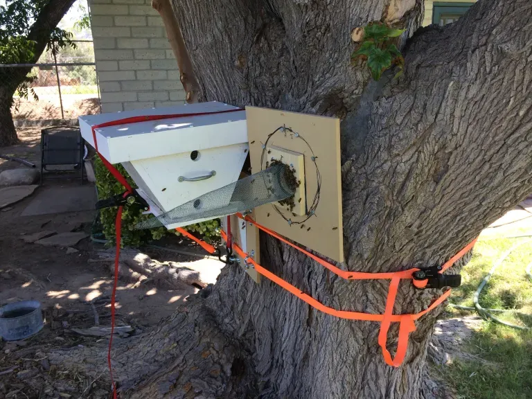 A trap out of a mulberry tree in El Paso Texas. This trap out took about 2 months to successfully relocate the honey bees. The relocation was done by Bill Hooten, Ralph Payan, and Bob Reneau